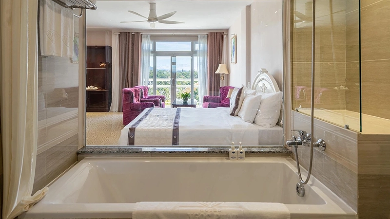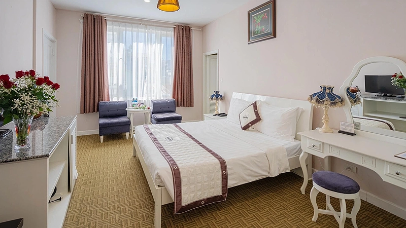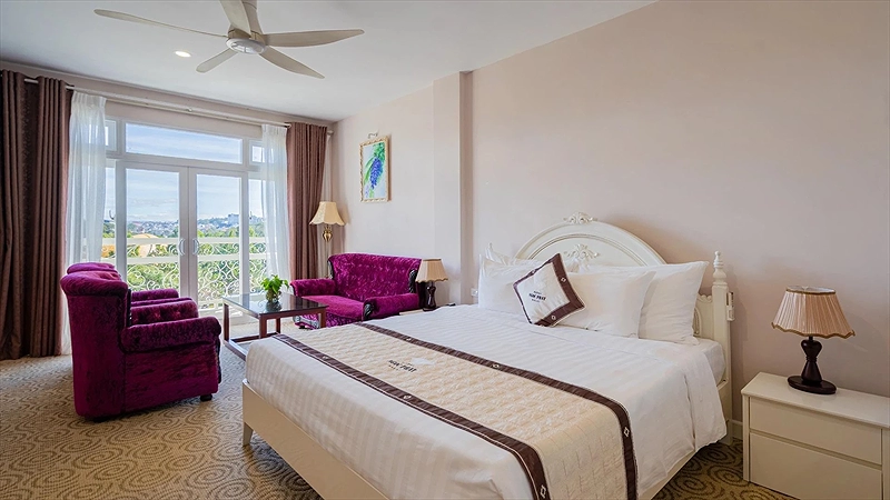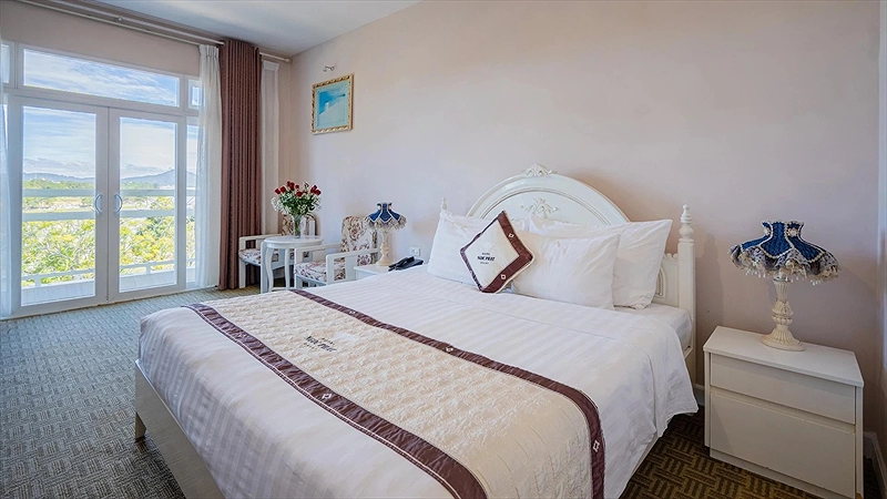 Phòng Nghỉ Sang Trọng Với Tầm Nhìn Đẹp: Khách sạn có hơn 65 phòng ngủ được thiết kế sang trọng và hiện đại, phần lớn các phòng hướng ra Hồ Xuân Hương và một số phòng khác hướng ra công viên và đồi thông - biểu tượng của Đà Lạt. Không gian trong mỗi phòng được bày trí tỉ mỉ, đảm bảo sự thoải mái và tiện nghi cho du khách.